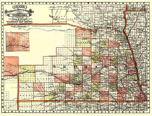 Nebraska Railroad and Townships - Cram 1875 White Modern Wood Framed Art Print with Double Matting by Cram