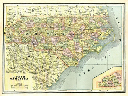 North Carolina - Cram 1886 White Modern Wood Framed Art Print with Double Matting by Cram
