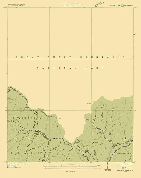 Bunches Bald North Carolina Quad - USGS 1935 White Modern Wood Framed Art Print with Double Matting by USGS