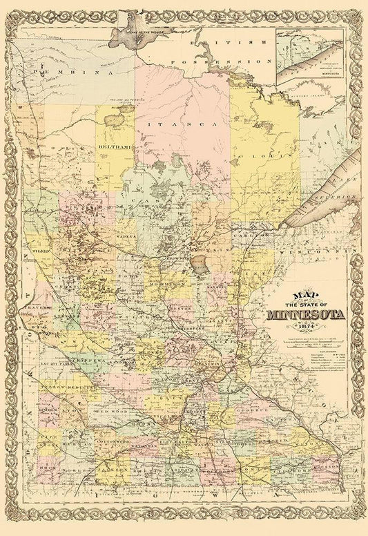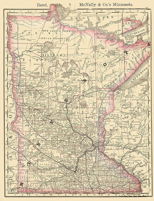Minnesota - Rand McNally 1879 White Modern Wood Framed Art Print with Double Matting by Rand McNally