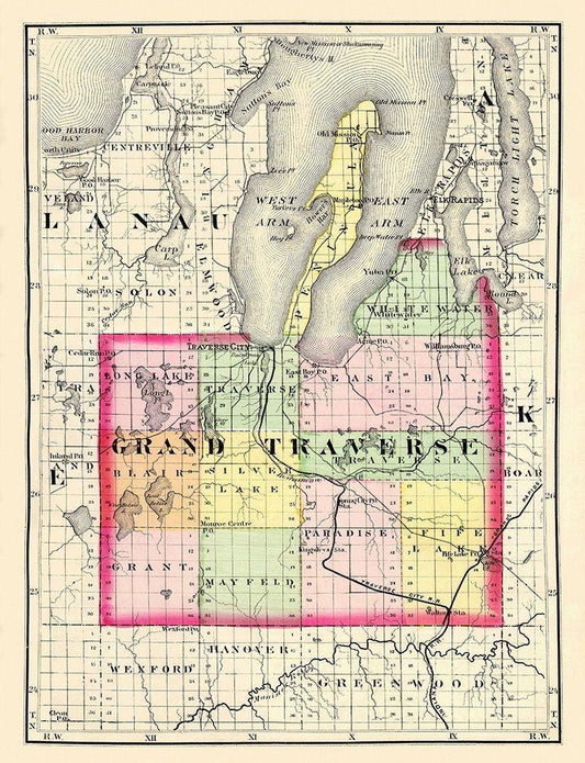 Grand Traverse Michigan - Walling 1873 White Modern Wood Framed Art Print with Double Matting by Walling