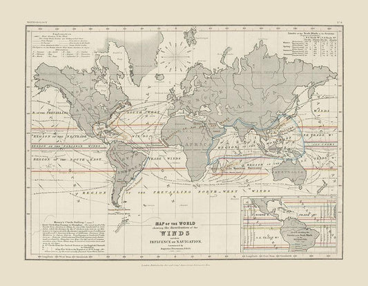 Mercator Projection - Longman 1829 White Modern Wood Framed Art Print with Double Matting by Longman