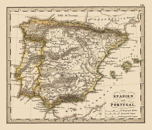 Spain Portugal - Stieler 1852 White Modern Wood Framed Art Print with Double Matting by Stieler
