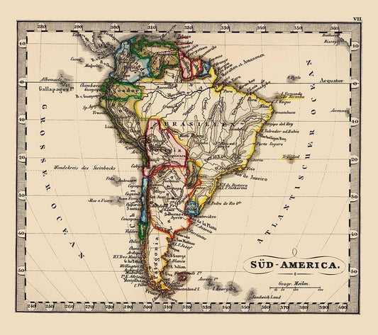 South America - Stieler 1852 White Modern Wood Framed Art Print with Double Matting by Stieler