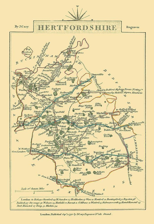 Hertfordshire County England - Cary 1792 White Modern Wood Framed Art Print with Double Matting by Cary
