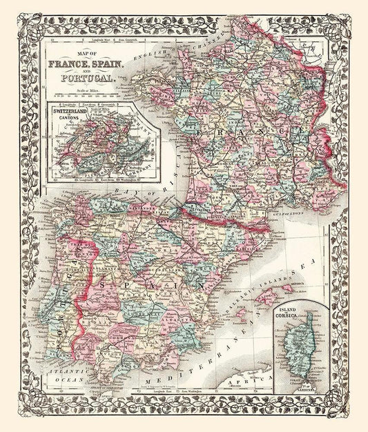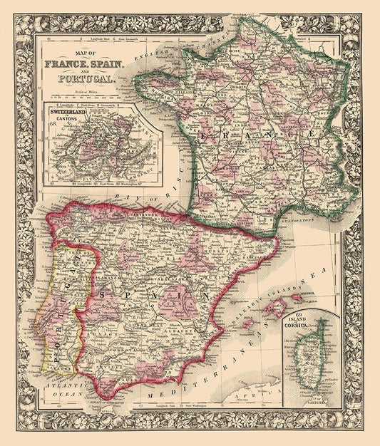 Europe France Spain Portugal - Mitchell 1867 White Modern Wood Framed Art Print with Double Matting by Mitchell