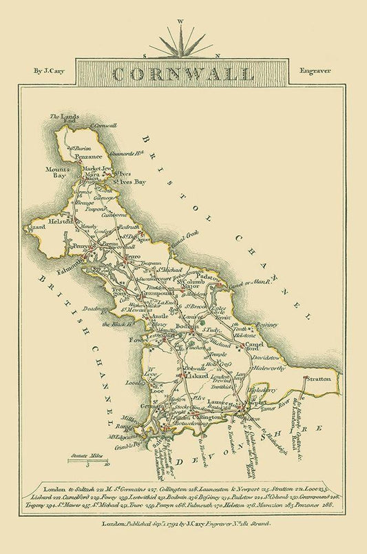 Cornwall County England - Cary 1792 White Modern Wood Framed Art Print with Double Matting by Cary