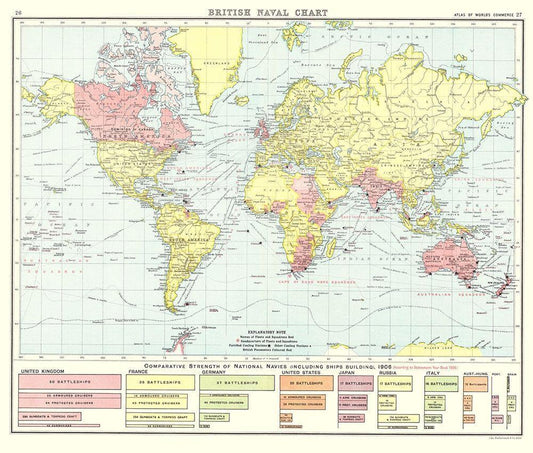 British Naval Chart Global - Newnes 1907 White Modern Wood Framed Art Print with Double Matting by Newnes