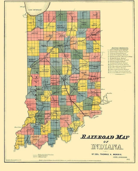 Railroad Map of Indiana - Morris 1852 White Modern Wood Framed Art Print with Double Matting by Morris
