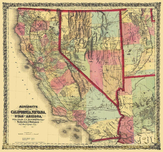 California, Nevada, Utah, Arizona - Bancroft 1873 White Modern Wood Framed Art Print with Double Matting by Bancroft