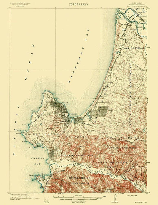 Monterey California Quad - USGS 1913 White Modern Wood Framed Art Print with Double Matting by USGS