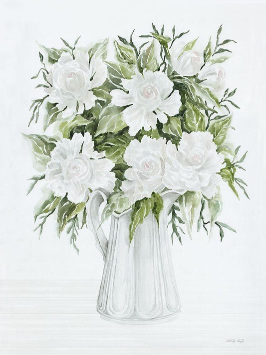 Pitcher of Peonies White Modern Wood Framed Art Print with Double Matting by Jacobs, Cindy