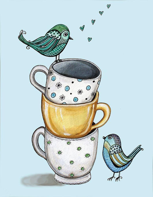Birds and Teacups White Modern Wood Framed Art Print with Double Matting by Tyndall, Elizabeth
