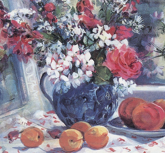 Blue Vase and Fruit White Modern Wood Framed Art Print with Double Matting by Unknown