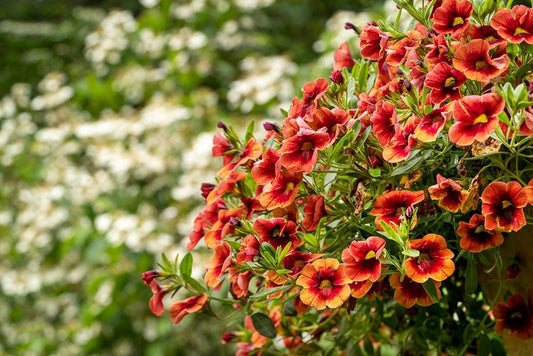 Hanging planters of Calibrachoa-or Million Bells or Trailing Petunia-They are herbaceous plants wit White Modern Wood Framed Art Print with Double Matting by Horton, Janet