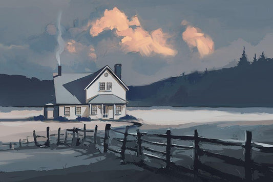 House on a Blue Lake White Modern Wood Framed Art Print with Double Matting by P.S. Art