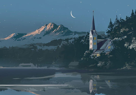 Church on a Blue Lake White Modern Wood Framed Art Print with Double Matting by P.S. Art