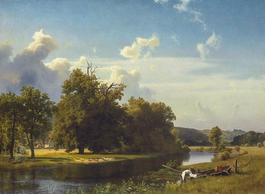 A River Landscape, Westphalia White Modern Wood Framed Art Print with Double Matting by Bierstadt, Albert