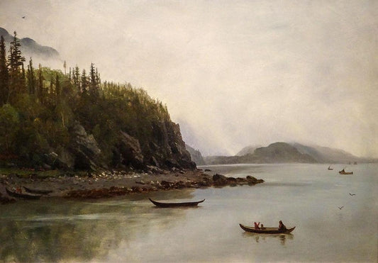 Indians Fishing White Modern Wood Framed Art Print with Double Matting by Bierstadt, Albert