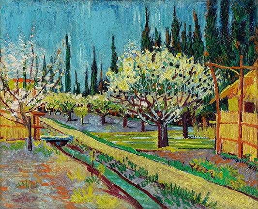Orchard Bordered by Cypresses (1888) White Modern Wood Framed Art Print with Double Matting by Van Gogh, Vincent