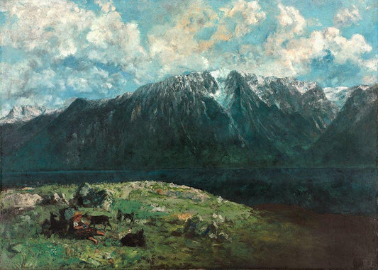 Panoramic View of the Alps, Les Dents du Midi White Modern Wood Framed Art Print with Double Matting by Courbet, Gustave