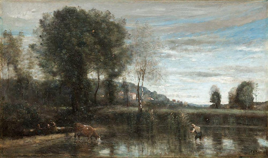 Pond at Ville-dAvray White Modern Wood Framed Art Print with Double Matting by Corot, Jean Baptiste Camille