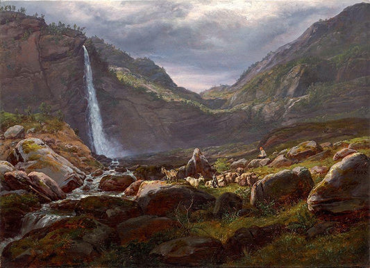 Feige Waterfall, Feigefossen, Lysterfjord, Norway White Modern Wood Framed Art Print with Double Matting by Dahl, Johan Christian Clausen