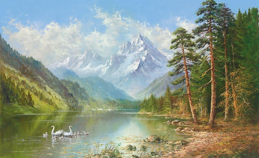 SWAN FAMILY IN SPRINGTIME White Modern Wood Framed Art Print with Double Matting by Glassl, Helmut