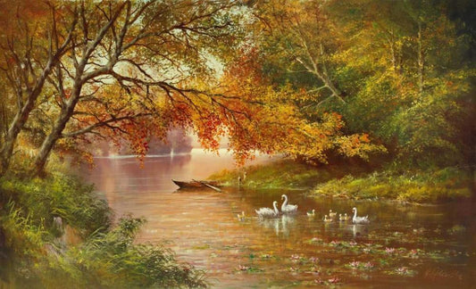 Swan Family In Autumn White Modern Wood Framed Art Print with Double Matting by Glassl, Helmut
