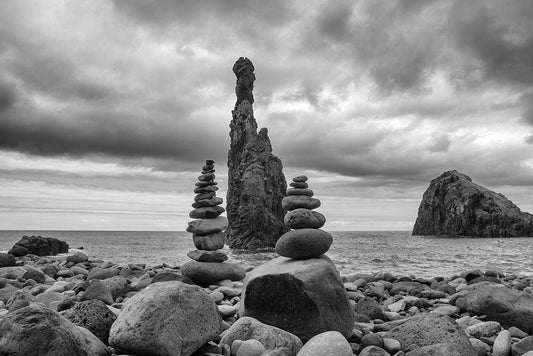 Balancing Stones White Modern Wood Framed Art Print with Double Matting by Kostka, Vladimir