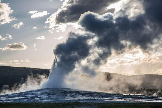Sunset eruption of Old Faithful, Yellowstone National Park White Modern Wood Framed Art Print with Double Matting by The Yellowstone Collection