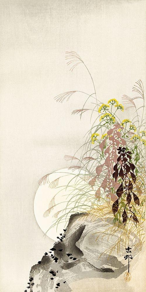 Grass and Full Moon White Modern Wood Framed Art Print with Double Matting by Koson, Ohara