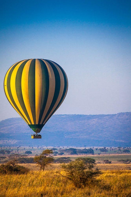 A hot-air balloon slowly traverses over the Serengeti plain White Modern Wood Framed Art Print with Double Matting by Richardson, Larry