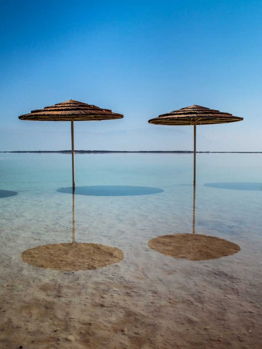 Parasol on beach of Dead Sea, Israel White Modern Wood Framed Art Print with Double Matting by Frank, Assaf