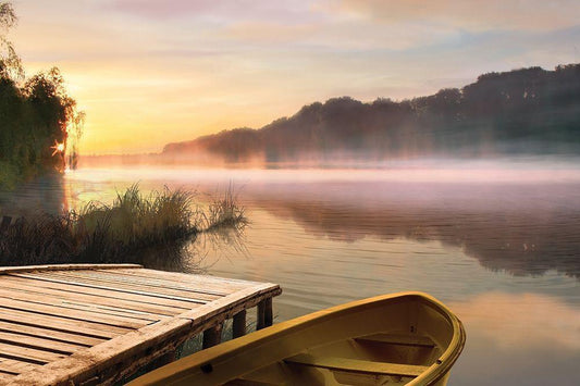Foggy Boat and Lake White Modern Wood Framed Art Print with Double Matting by Anonymous