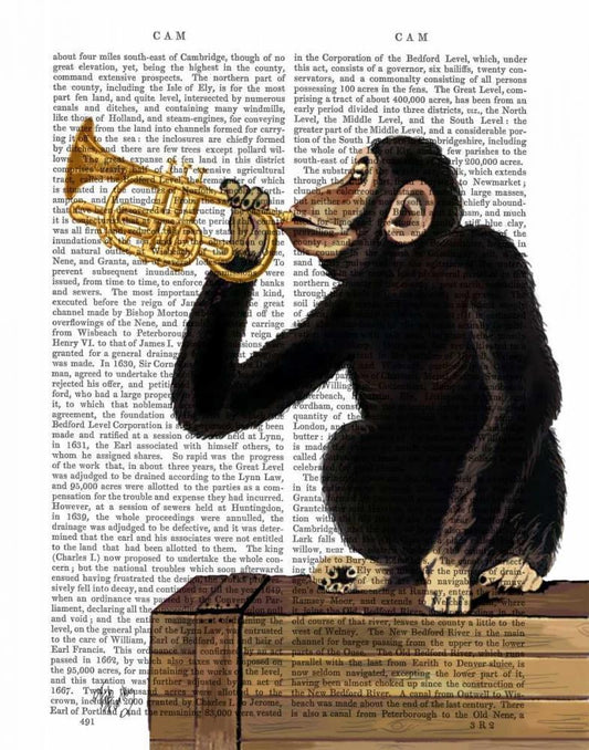 Monkey Playing Trumpet White Modern Wood Framed Art Print with Double Matting by Fab Funky