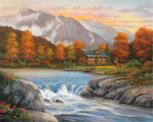 Cabin on Halloween Lake White Modern Wood Framed Art Print with Double Matting by Zaccheo, John