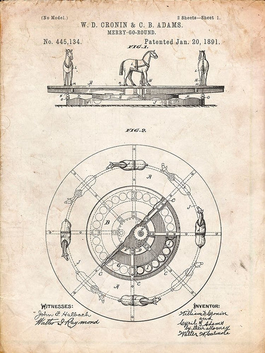 PP351-Vintage Parchment Carousel 1891 Patent Poster White Modern Wood Framed Art Print with Double Matting by Borders, Cole