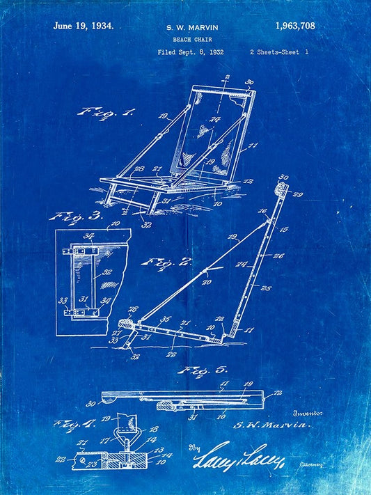PP696-Faded Blueprint 1930s Beach Chair Wall Art Poster White Modern Wood Framed Art Print with Double Matting by Borders, Cole