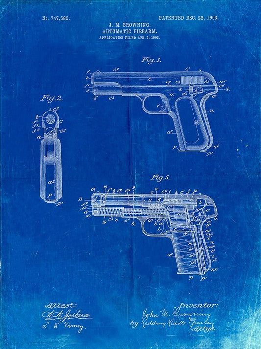 PP755-Faded Blueprint Browning No. 2 Handgun Patent Poster White Modern Wood Framed Art Print with Double Matting by Borders, Cole