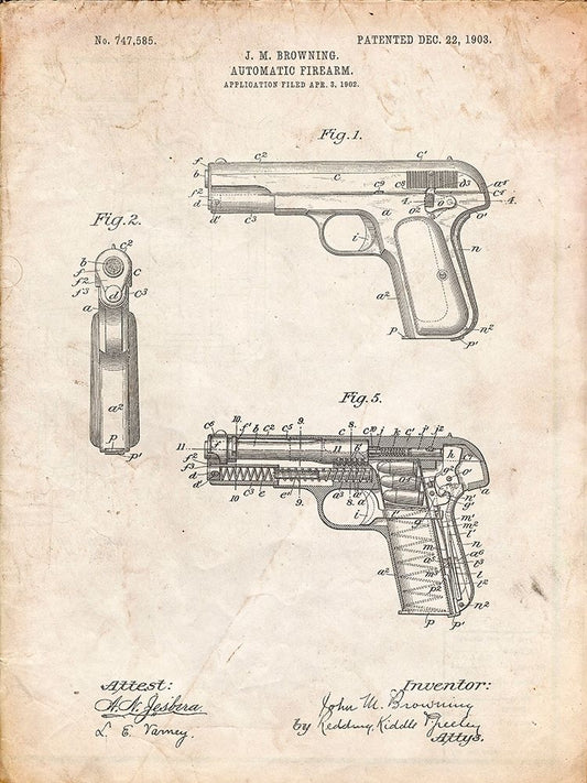 PP755-Vintage Parchment Browning No. 2 Handgun Patent Poster White Modern Wood Framed Art Print with Double Matting by Borders, Cole