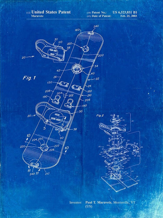 PP760-Faded Blueprint Burton Touring Snowboard Patent Poster White Modern Wood Framed Art Print with Double Matting by Borders, Cole