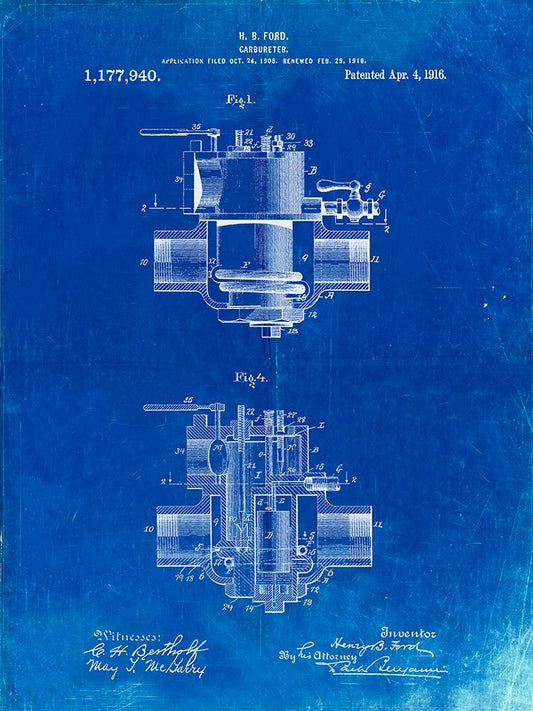 PP835-Faded Blueprint Ford Carburetor 1916 Patent Poster White Modern Wood Framed Art Print with Double Matting by Borders, Cole