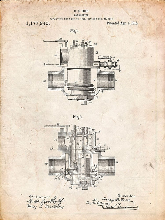 PP835-Vintage Parchment Ford Carburetor 1916 Patent Poster White Modern Wood Framed Art Print with Double Matting by Borders, Cole