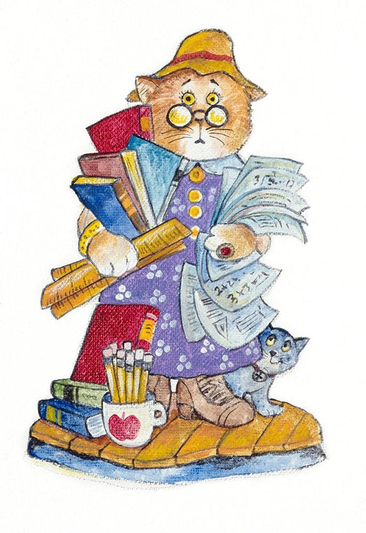 Teacher Cat White Modern Wood Framed Art Print with Double Matting by Bell, Bill