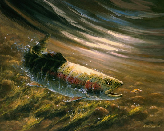 The Chase - Rainbow Trout White Modern Wood Framed Art Print with Double Matting by Langton, Bruce