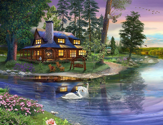 Headlights on the Lake White Modern Wood Framed Art Print with Double Matting by Bigelow Illustrations- Exclusive