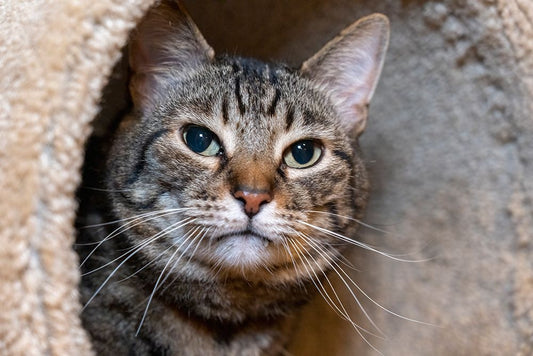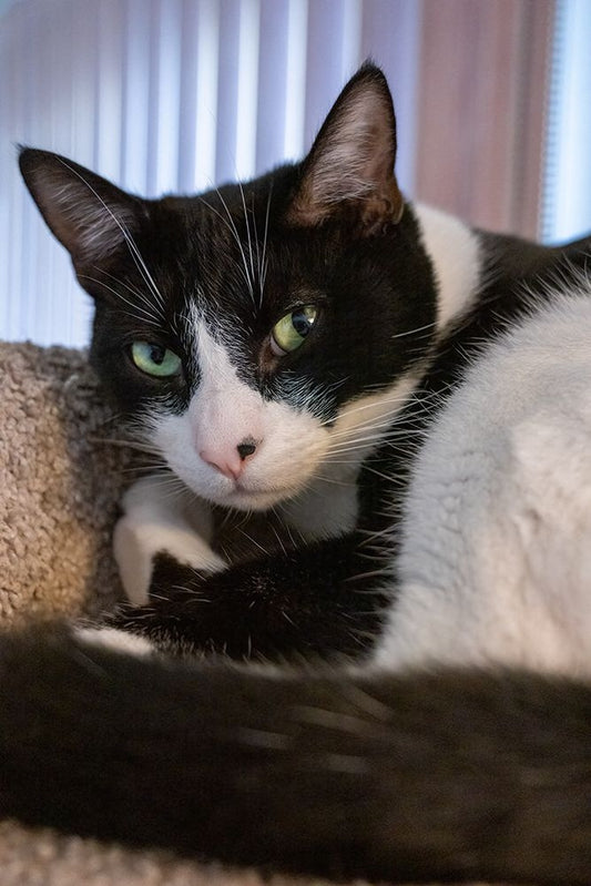 Black and white cat resting on its cat tower Black Ornate Wood Framed Art Print with Double Matting by Horton, Janet