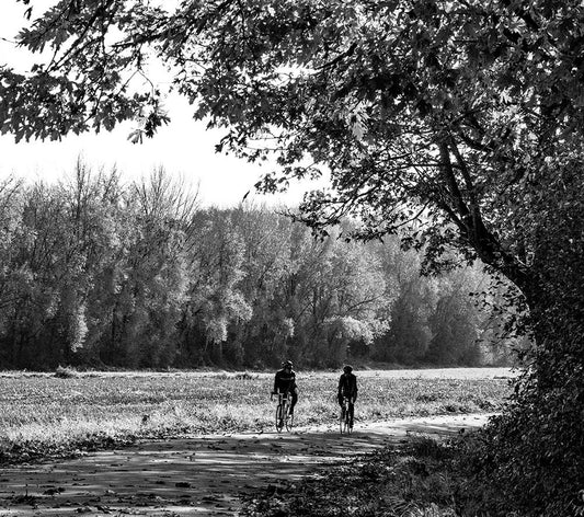 USA-Washington State-Fall City black and white two bike riders along Neal Rd SE Black Ornate Wood Framed Art Print with Double Matting by Gulin, Sylvia