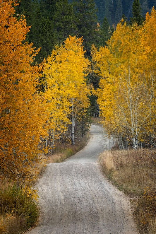 Gravel backroad and autumn aspen trees-Grand Teton National Park-Wyoming Black Ornate Wood Framed Art Print with Double Matting by Jones, Adam